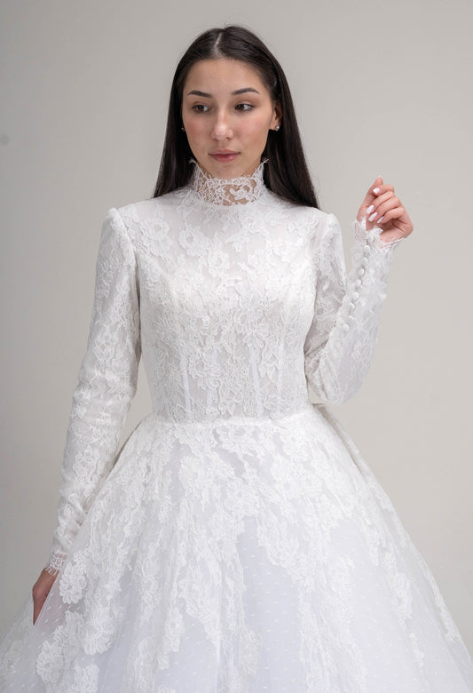 LOOK 27 Modest french corded lace sleeves fully lined bridal gown (Model WG2024-27)